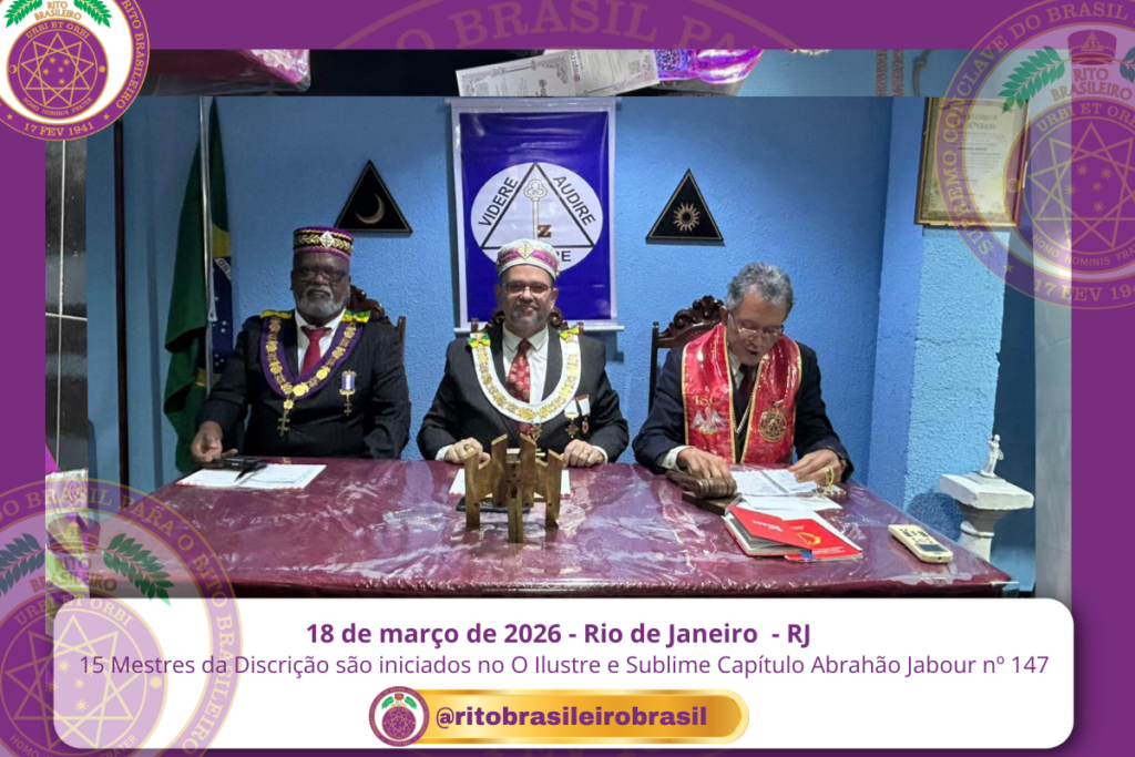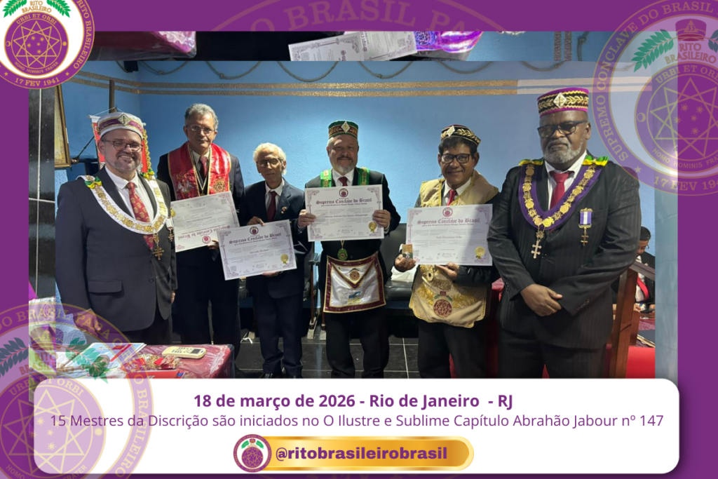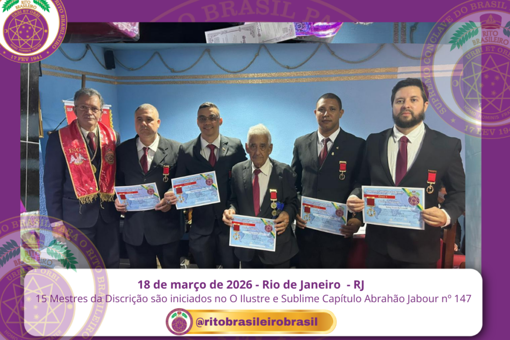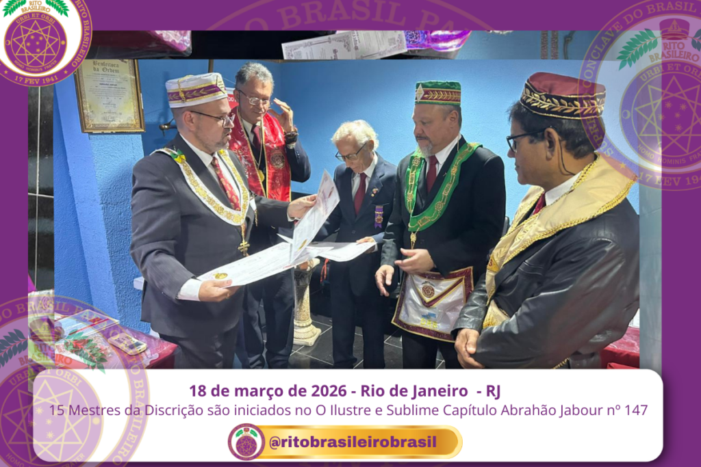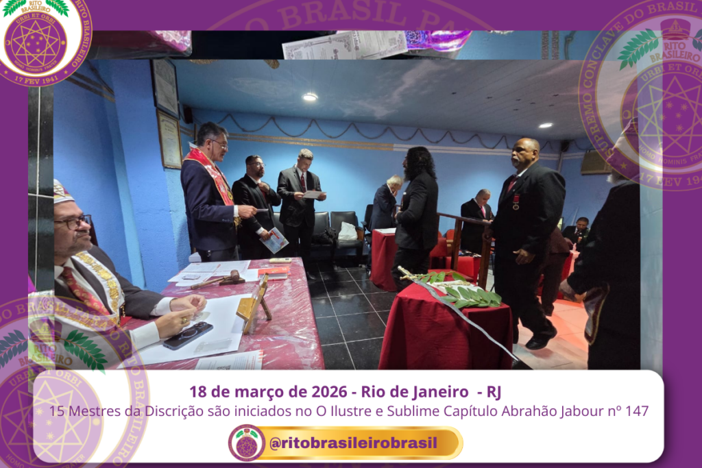 No dia 18 de março de 2026, o O Ilustre e Sublime Capítulo Abrahão Jabour nº 147, no Vale de Bangu, no Clima do Rio de Janeiro, realizou uma marcante sessão de iniciação de 15 novos Ilustres Irmãos no Grau 4 – Mestre da Discrição, fortalecendo ainda mais os Altos Graus Filosóficos do Rito Brasileiro de Maçons Antigos, Livres e Aceitos.