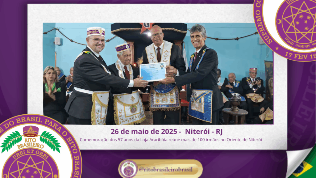 No dia vinte e seis de maio de dois mil e vinte e cinco, o Soberano Grande Primaz Juliano Coelho Braga esteve presente na comemoração dos 57 anos da Augusta e Respeitável Loja Simbólica Araribóia nº 1698, ao Oriente de Niterói/RJ. Essa importante Oficina foi a segunda Loja a ser fundada no Rito Brasileiro após sua reimplantação vitoriosa em 04 de maio de 1968, reafirmando sua relevância histórica para todos os obreiros do nosso rito.