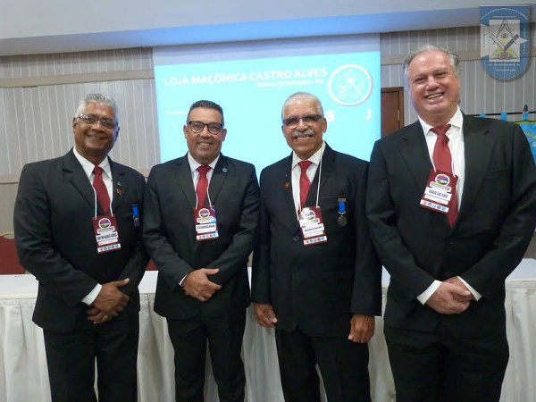 A partir da esquerda, o Em.’ Ir.’. Glauber Soares 33º, o Pod.’. Ir.’. Julio Cesar da Costa, o Ser.’.Ir.’. Cesar Dourado 33º e o Sapientíssimo Ir.’. Edmundo Ferreira Lima (Ordem D. Pedro I)