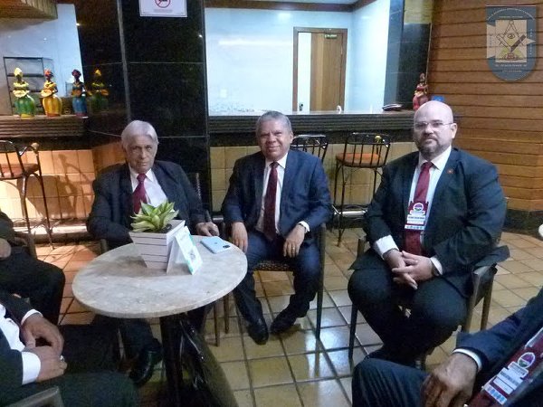 No Lobby do hotel, o Sob.’. Ir.’. Nei Inocencio dos Santos e o Em.’. Ir.’. Oscimar Alves Torres, conversando com os Irmãos Juliano Coelho Braga, Macos Antônio São Pedro, Hipólito Peixinho da Silva 33º, Júlio Cesar da Costa