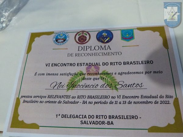 Prosseguindo as homenagens, o Grão-Mestre Estadual do GOB-BA, Eminente Irmão OSCIMAR ALVES TORRES, fez a entrega do Troféu de Palestrante do VI ENCONTRO ESTADUAL DO RITO BRASILEIRO, ao Sob.’. Ir.’. NEI INOCENCIO DOS SANTOS 33º, acompanhado de um Diploma de Reconhecimento por ter prestado serviços relevantes ao Rito Brasileiro no VI Encontro Estadual do Rito de Brasileiro.