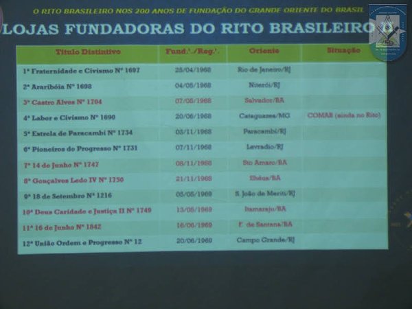 Ao final da sua apresentação destacou as Lojas baianas que podem ostentar em seus estandartes o título de LOJAS FUNDADORAS DO RITO BRASILEIRO, de acordo coma Constituição do Rito Brasileiro, de 1968.