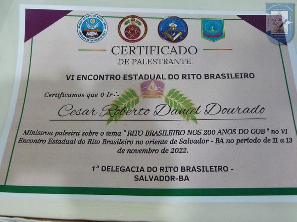 Ao final da sua apresentação, o Em.’. Ir.’. OSCIMAR ALVES TORRES, Grão-Mestre do GOB-BA, agradeceu a participação do Ser.’. Irmão, no ensejo, fez a entrega do Troféu de Palestrante do VI Encontro Estadual do Rito Brasileiro, acompanhado do Diploma de Reconhecimento. O Ser.’. Ir.’. CESAR ROBERTO DANIEL DOURADO 33º, agradeceu a homenagem, e também pelo convite efetuado para participar desse importante evento, mais ainda, por ter sido honrado em ser o palestrante da abertura dos trabalhos.