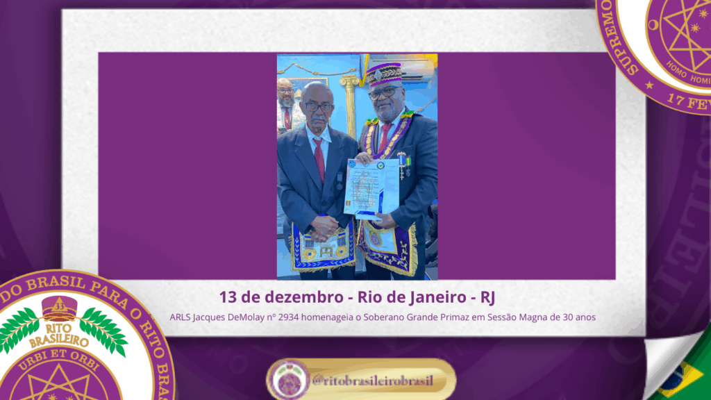 No dia treze de dezembro de dois mil e vinte e cinco, a Augusta e Respeitável Loja Simbólica Jacques DeMolay nº 2934, do Rito Brasileiro, realizou, ao Oriente de sua jurisdição, uma emocionante Sessão Magna Comemorativa pelos seus 30 anos de fundação, celebrando três décadas de História, Trabalho e Fraternidade.
