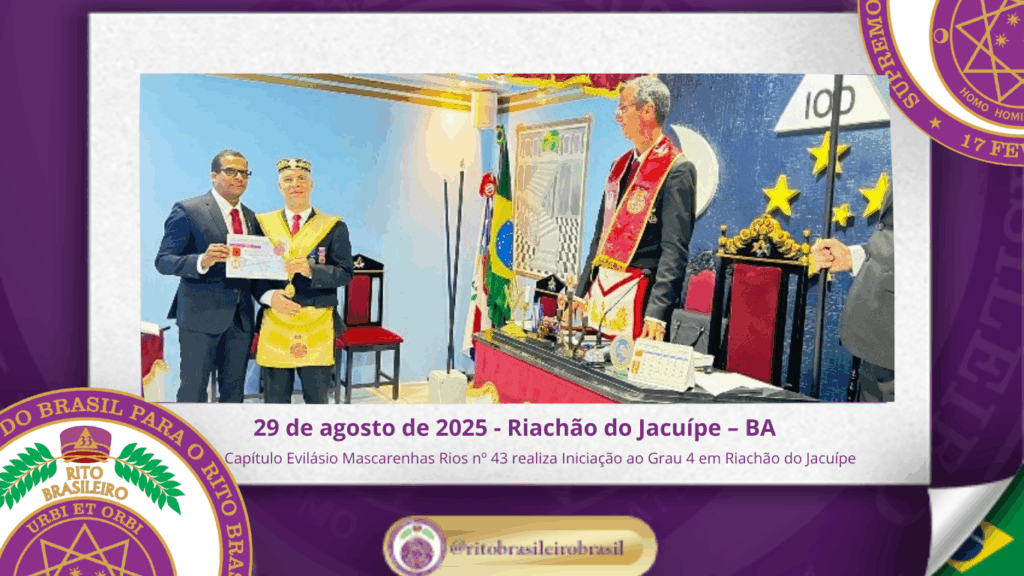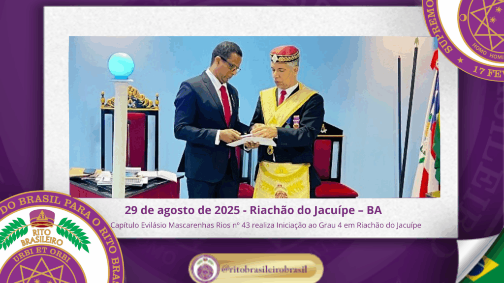 No dia vinte e nove de agosto de dois mil e vinte e cinco, o Ilustre e Sublime Capítulo Evilásio Mascarenhas Rios nº 43, ao Vale de Riachão do Jacuípe – BA, realizou uma Sessão Magna de Iniciação ao Grau 4 – Mestre da Discrição do Rito Brasileiro, no templo da Augusta e Respeitável Loja Simbólica 14 de Agosto, jurisdicionada ao GOB-Baiano.