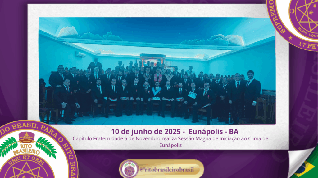 No dia dez de junho de dois mil e vinte e cinco, foi realizada, ao Clima de Eunápolis, Bahia, a Sessão Magna de Iniciação ao Grau 4 – Mestre da Discrição, no seio do Ilustre e Sublime Capítulo Fraternidade 5 de Novembro nº 30.