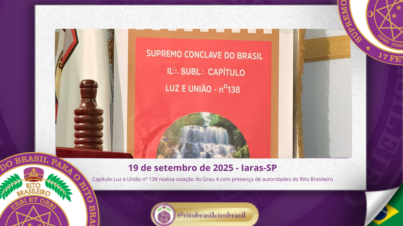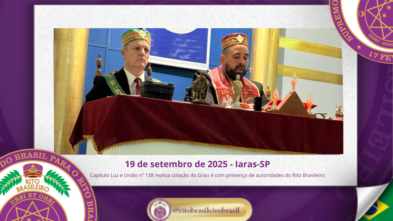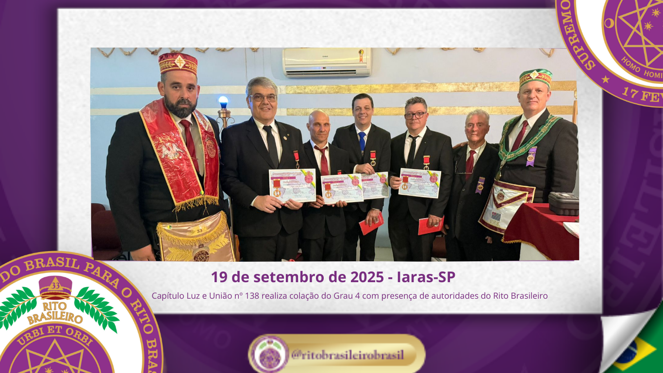 No dia dezenove de setembro de dois mil e vinte e cinco, o Ilustre e Sublime Capítulo Luz e União nº 138, ao Vale de Iaras-SP, realizou uma memorável Sessão Magna de Colação do Grau 4 – Mestre da Discrição, marcando o ingresso nos Altos Graus do Rito Brasileiro de Maçons Antigos, Livres e Aceitos de quatro novos obreiros.