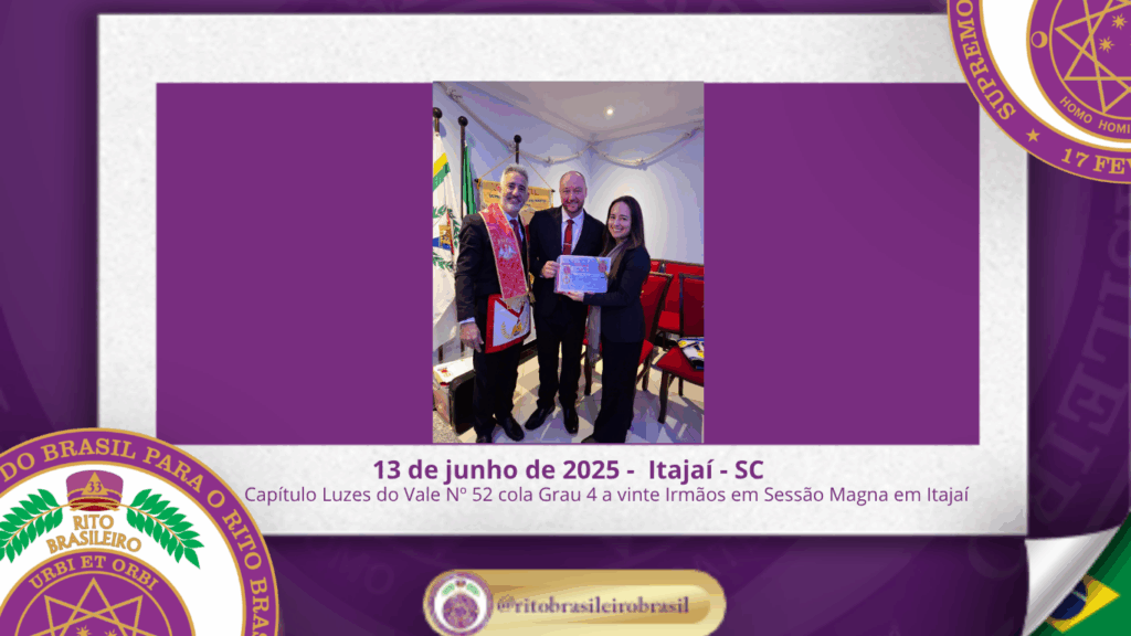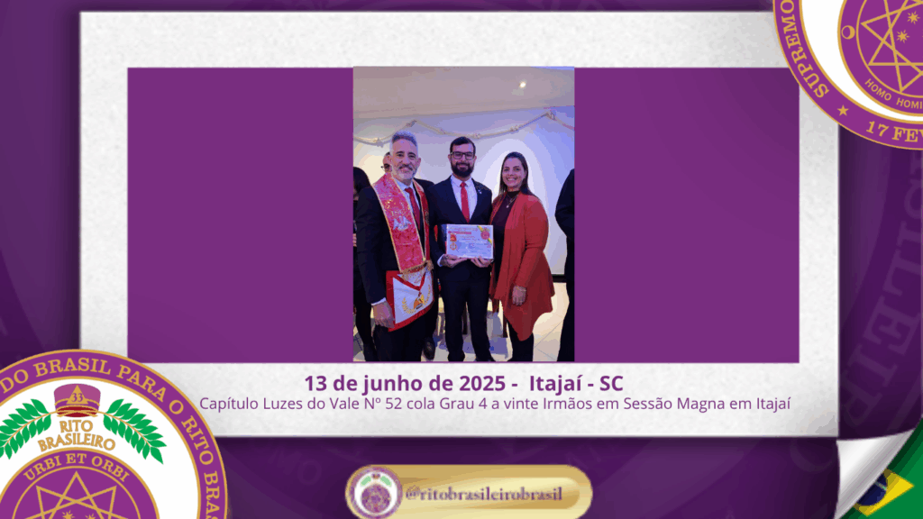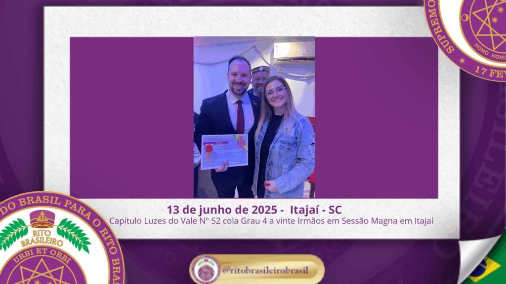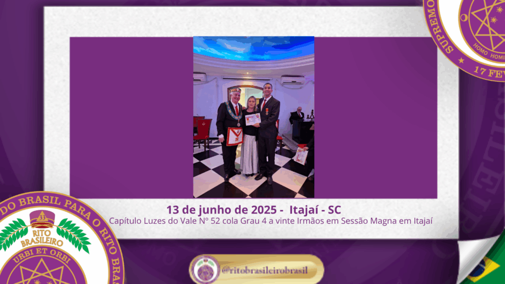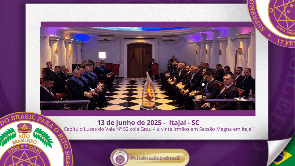 No dia treze de junho de dois mil e vinte e cinco, ao Clima de Itajaí/SC, o Ilustre e Sublime Capítulo Luzes do Vale Nº 52 realizou uma Sessão Magna de Colação do Grau 4 – Mestre da Discrição, em uma noite de elevado significado filosófico para o Rito Brasileiro.