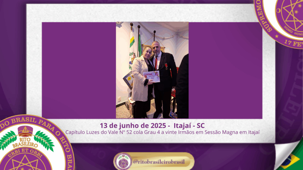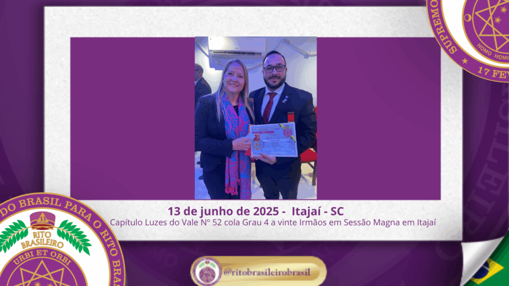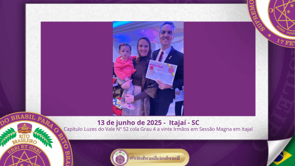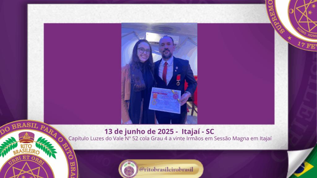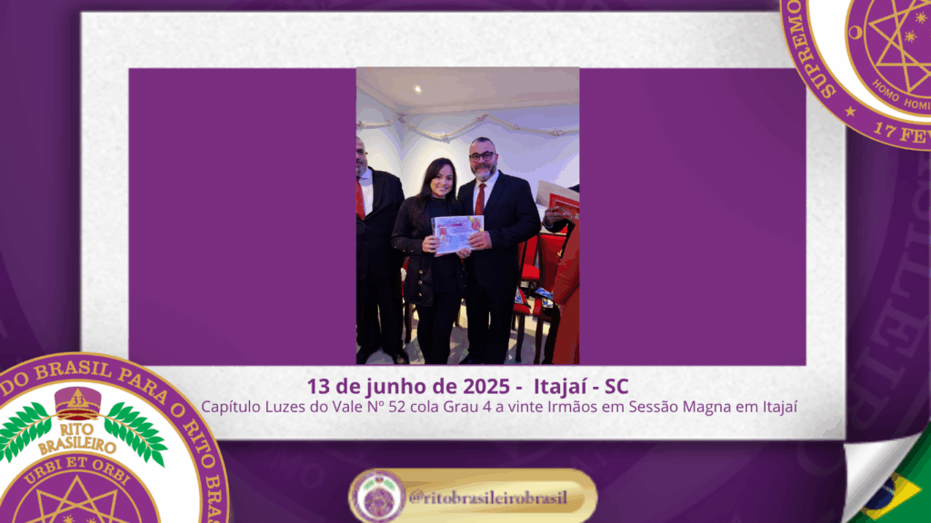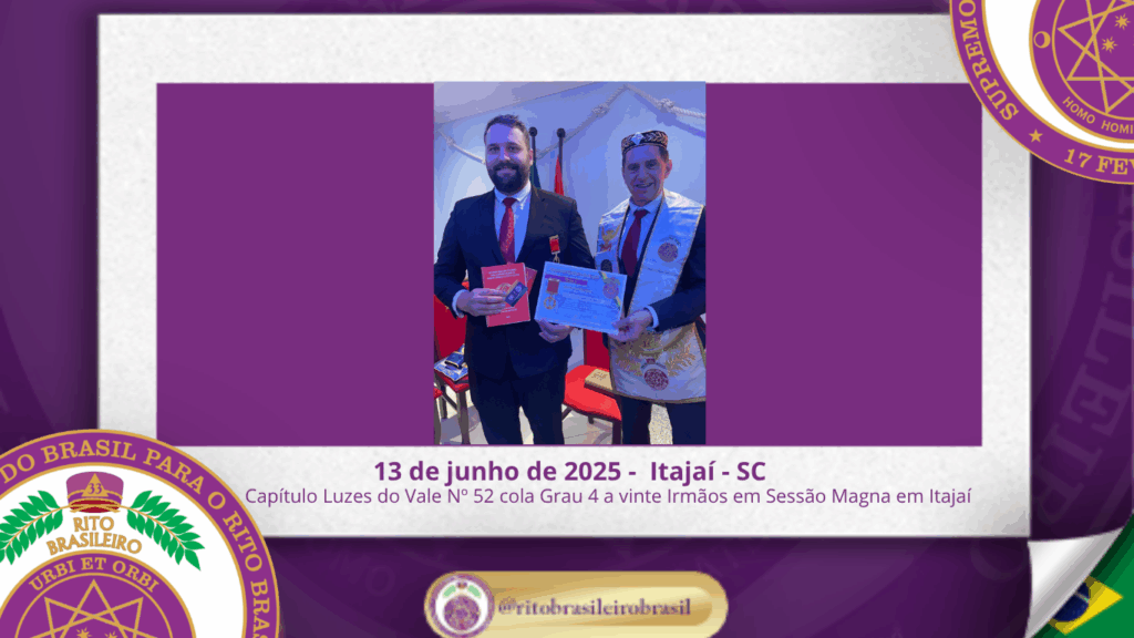 No dia treze de junho de dois mil e vinte e cinco, ao Clima de Itajaí/SC, o Ilustre e Sublime Capítulo Luzes do Vale Nº 52 realizou uma Sessão Magna de Colação do Grau 4 – Mestre da Discrição, em uma noite de elevado significado filosófico para o Rito Brasileiro.