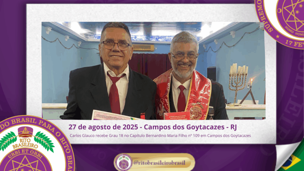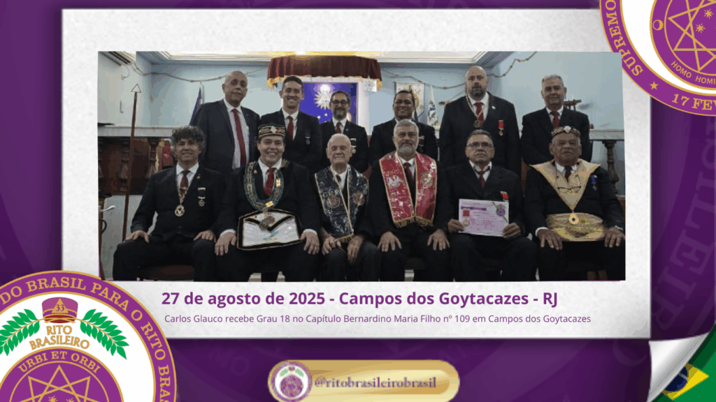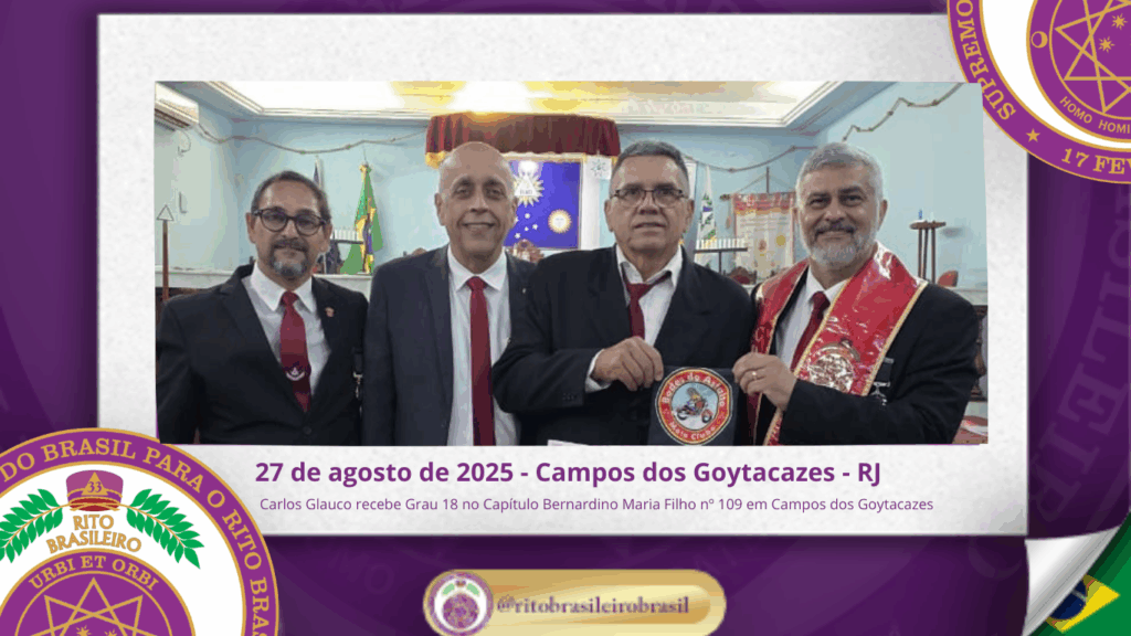 No dia vinte e sete de agosto de dois mil e vinte e cinco, ao Clima de Campos dos Goytacazes/RJ, foi realizada, nas colunas do Ilustre e Sublime Capítulo Bernardino Maria Filho nº 109, a Colação do Grau 18 – Cavaleiro Rosa-Cruz do Ilustre Irmão Carlos Glauco Barbosa da Silva Rachador, reafirmando a força e a vitalidade do Rito Brasileiro no âmbito da 13ª Delegacia Litúrgica do Estado do Rio de Janeiro.