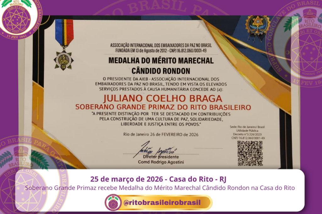 No dia 25 de março de 2026, na Casa do Rito Brasileiro, foi vivenciado um momento de grande reconhecimento institucional ao Soberano Grande Primaz Juliano Coelho Braga, que recebeu em mãos a Medalha do Mérito Marechal Cândido Rondon, concedida pela Associação Internacional dos Embaixadores da Paz no Brasil (AIEB). 🎖 Reconhecimento de relevância nacional A […]