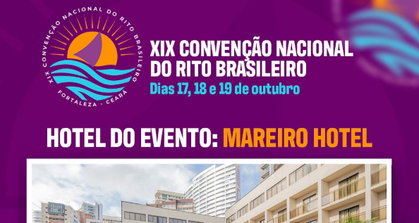 A XIX Convenção Nacional do Rito Brasileiro será em solo Cearense. 🤩 E o local do evento será no Mareiro Hotel. Ele fica a poucos minutos das melhores atrações turísticas de Fortaleza. Passe para o lado e confira! Vamos Fortalezear? ✈️ 🗓️ Dias 17, 18 e 19 de outubro de 2025, aguardamos vocês em Fortaleza! […]