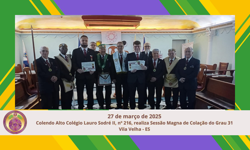 No dia 27 de março de 2025, foi realizada a Sessão Magna de Colação do Grau 31, dos Altos Graus Filosóficos do Rito Brasileiro, no Colendo Alto Colégio Lauro Sodré II, nº 216, ao Clima de Vila Velha – ES. A belíssima cerimônia foi conduzida com notável elevação ritualística pelo Egrégio Mestre Maurício Roselli, que […]