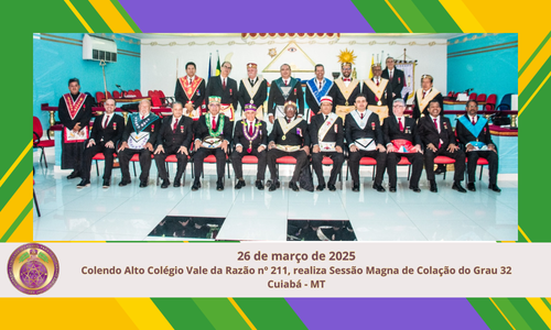 SUPREMO CONCLAVE DO BRASIL PARA O RITO BRASILEIRO DE MAÇONS ANTIGOS LIVRES E ACEITOS- 84 ANOS. No dia 26 de março de 2025, ao Clima de Cuiabá – MT, o Colendo Alto Colégio Vale da Razão, nº 211, sob a presidência do Egrégio Mestre, o Poderoso Irmão Valtemir Chocolate Aparecido da Silva, realizou a sessão […]