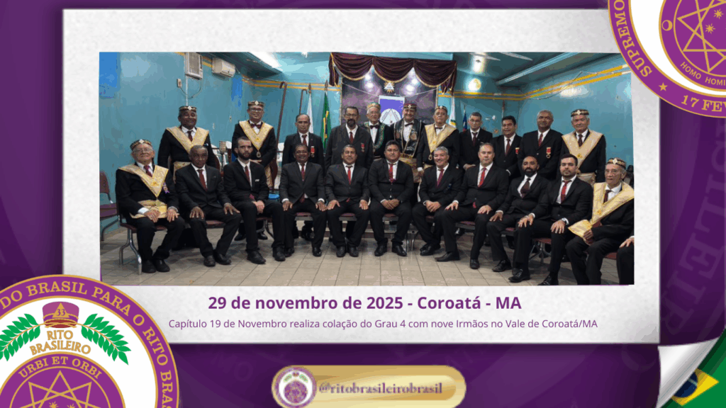 O Ilustre e Sublime Capítulo 19 de Novembro nº 19, ao Vale de Coroatá/MA, realizou a colação de nove Irmãos no Grau 4 – Mestre da Discrição, em Sessão presidida pelo Eminente Irmão Jodomir Bento Lindoso Junior, com presença de autoridades filosóficas do Grau 33. 🕯️ Nove novos Mestres da Discrição no Capítulo 19 de […]