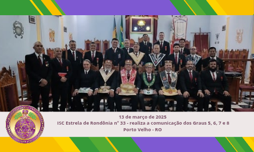 O Ilustre e Sublime Capitulo Estrela de Rondônia, n⁰ 33, ao Vale de Porto Velho-RO, realizou no dia 13 de março de 2025, a Sessão Especial de Concessão por Comunicação dos Graus 5, 6, 7 e 8 a três Irmãos.