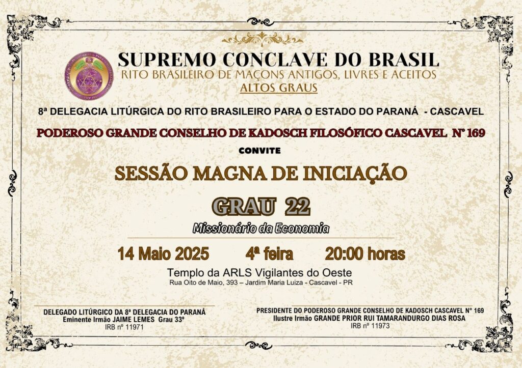 O Poderoso Grande Conselho Kadosch Filosófico Cascavel nº 169tem a honra de convidar para aSessão Magna de Iniciação ao Grau 22 – Missionário da Economia 📅 Data: 14 de maio de 2025🕗 Horário: 20 horas📍 Local: Templo da A∴R∴L∴S∴ Vigilantes do OesteRua Oito de Maio, 393 – Jardim Maria Luiza – Cascavel/PR