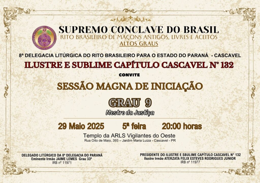 O Ilustre e Sublime Capítulo Cascavel nº 132tem a honra de convidar para aSessão Magna de Iniciação ao Grau 9 – Mestre da Justiça 📅 Data: 29 de maio de 2025🕗 Horário: 20 horas📍 Local: Templo da A∴R∴L∴S∴ Vigilantes do OesteRua Oito de Maio, 393 – Jardim Maria Luiza – Cascavel/PR