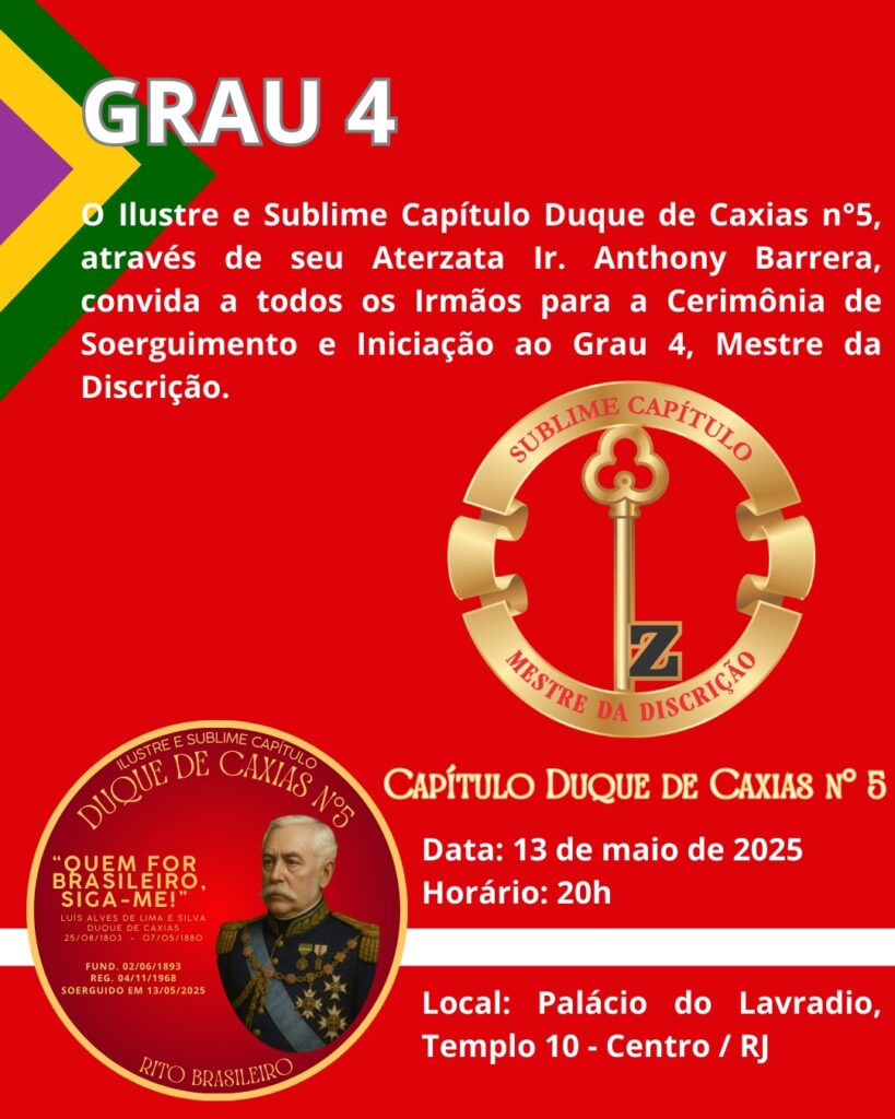 O Ilustre e Sublime Capítulo Duque de Caxias nº 5tem a honra de convidar para aCerimônia de Soerguimento e Iniciação ao Grau 4 – Mestre da Discrição 📅 Data: 13 de maio de 2025🕗 Horário: 20 horas📍 Local: Palácio do Lavradio, Templo 10 – Centro, Rio de Janeiro/RJ