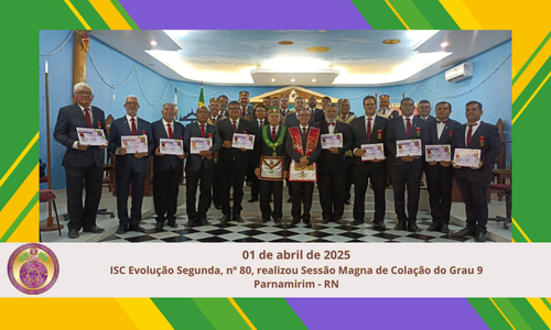 No dia 01/04/2025, foi realizada no ISC Evolução Segunda, nº 80, ao Vale de Parnamirim/RN a Sessão Magna de Colação do Grau 9 – Mestre da Justiça – de 10 IIr.:, Alex Rogerdan, James Meneses, Franklin Paulino, Edvaldo Feliciano, Valdemir Targino, Ralph Pereira, Paulo Teixeira, Paulo Soares, Wagner Guerra e Wolney Erick. Foi Presidida pelo […]