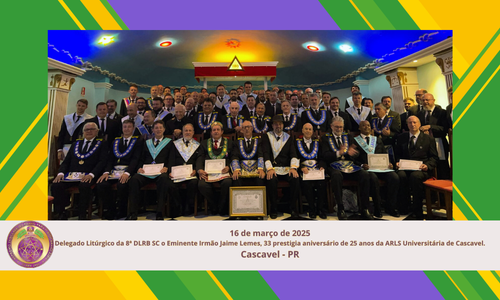No dia 16 de março de 2025, o Delegado Litúrgico da 8ª DLRB-SC, o Eminente Irmão Jaime Lemes, 33, representando o Soberano Grande Primaz do Supremo Conclave do Rito Brasileiro, prestigiou o aniversário de 25 anos da ARLS Universitária de Cascavel. A sessão foi presidida pelo Venerável Mestre, Irmão Júnior Scherer, e contou com a […]