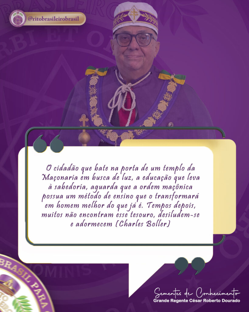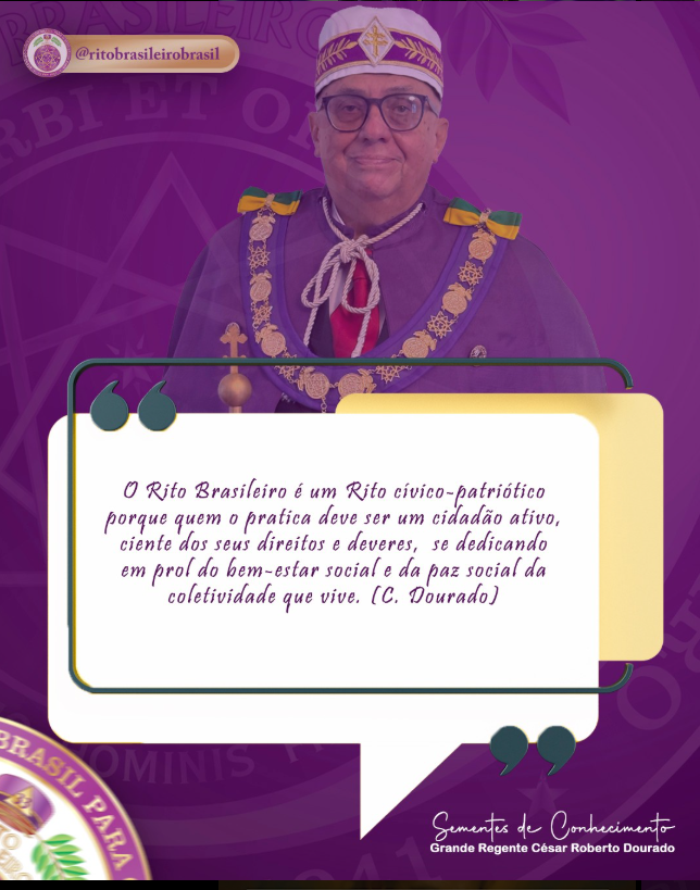 “O Rito Brasileiro é precursor da Maçonaria Renovada, aquela que não fica engessada aos ensinamentos de 1750, pois a Tradição não pode obstar a Evolução.”(C. Dourado) Sementes de ConhecimentoGrande Regente César Roberto Dourado