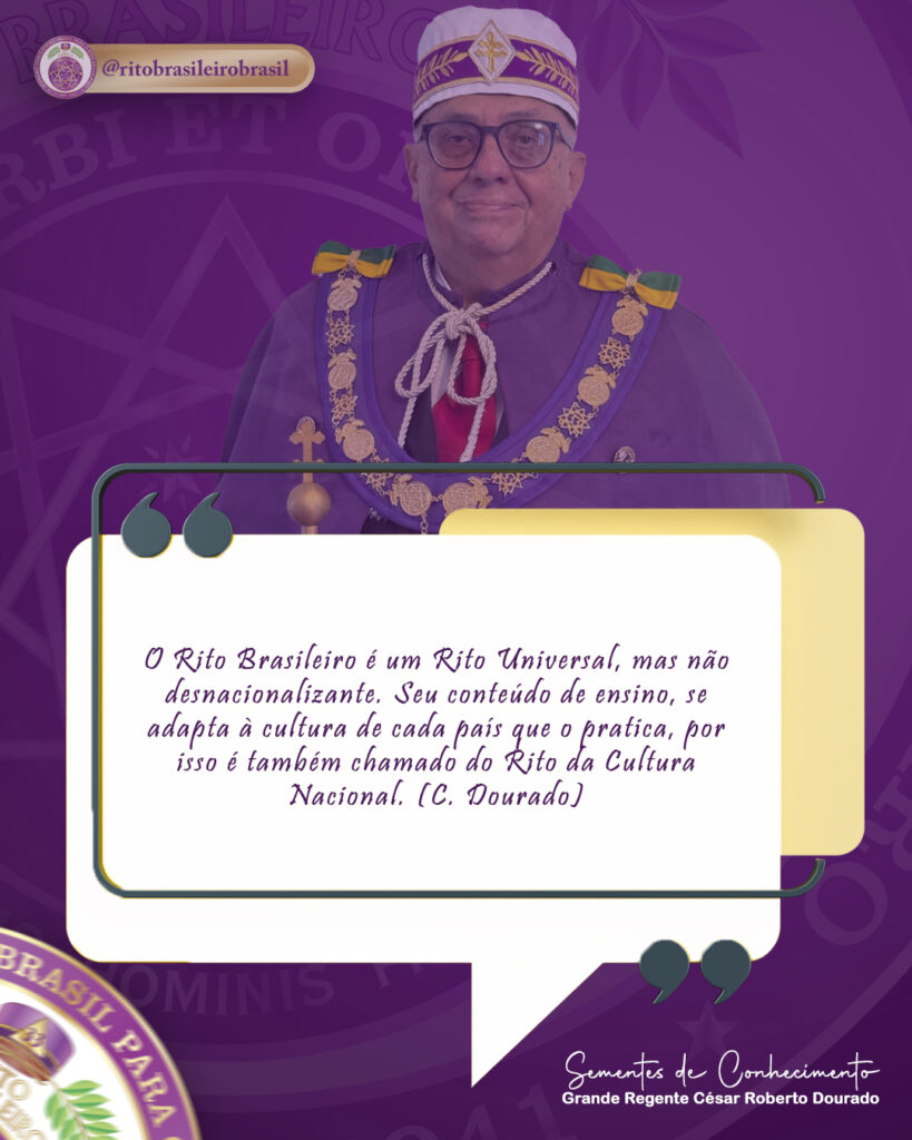 “O Rito Brasileiro é um Rito Universal, mas não desnacionalizante. Seu conteúdo de ensino, se adapta à cultura de cada país que o pratica, por isso é também chamado do Rito da Cultura Nacional.”(C. Dourado) Sementes de ConhecimentoGrande Regente César Roberto Dourado