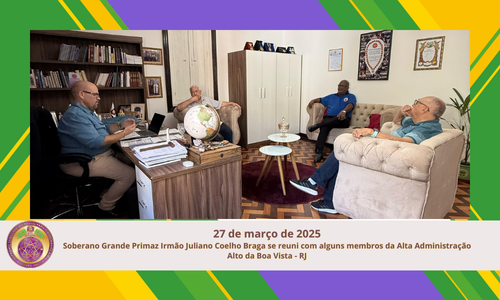 Hoje, 27 de março de 2025, o Soberano Grande Primaz Irmão Juliano Coelho Braga se reuni com alguns membros da Alta Administração. O Grande Regente César Dourado, Grande Chanceler João Dias, Chefe de Gabinete Eduardo Gomes de Souza, discutindo assuntos de interesse do Supremo Conclave do Brasil.