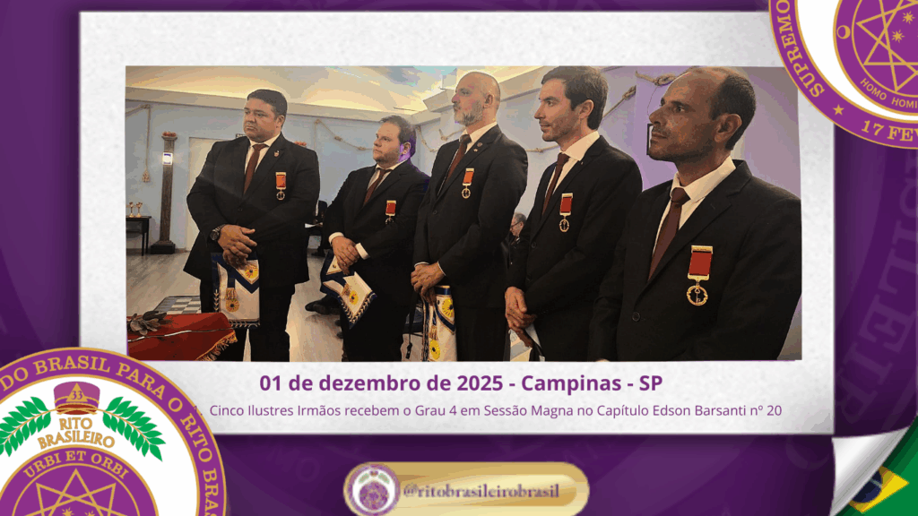 No dia primeiro de dezembro do ano de dois mil e vinte e cinco, o Ilustre e Sublime Capítulo Ir∴ Edson Barsanti – nº 20, ao Vale de Campinas, realizou uma significativa Sessão Magna de Colação do Grau 4 – Mestre da Discrição, marcando o fortalecimento e a expansão do Rito Brasileiro de Maçons Antigos, Livres e Aceitos ao Clima de São Paulo.