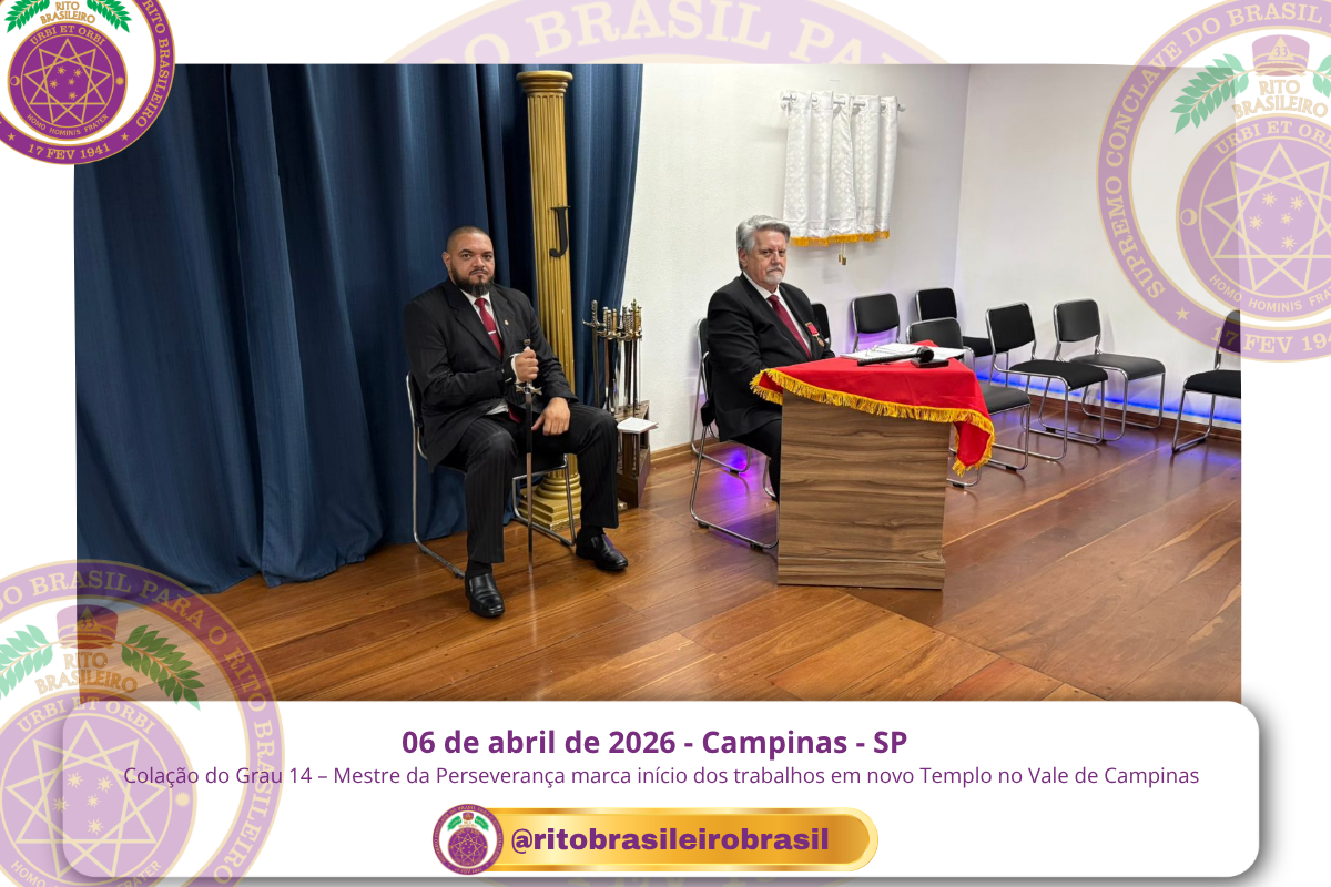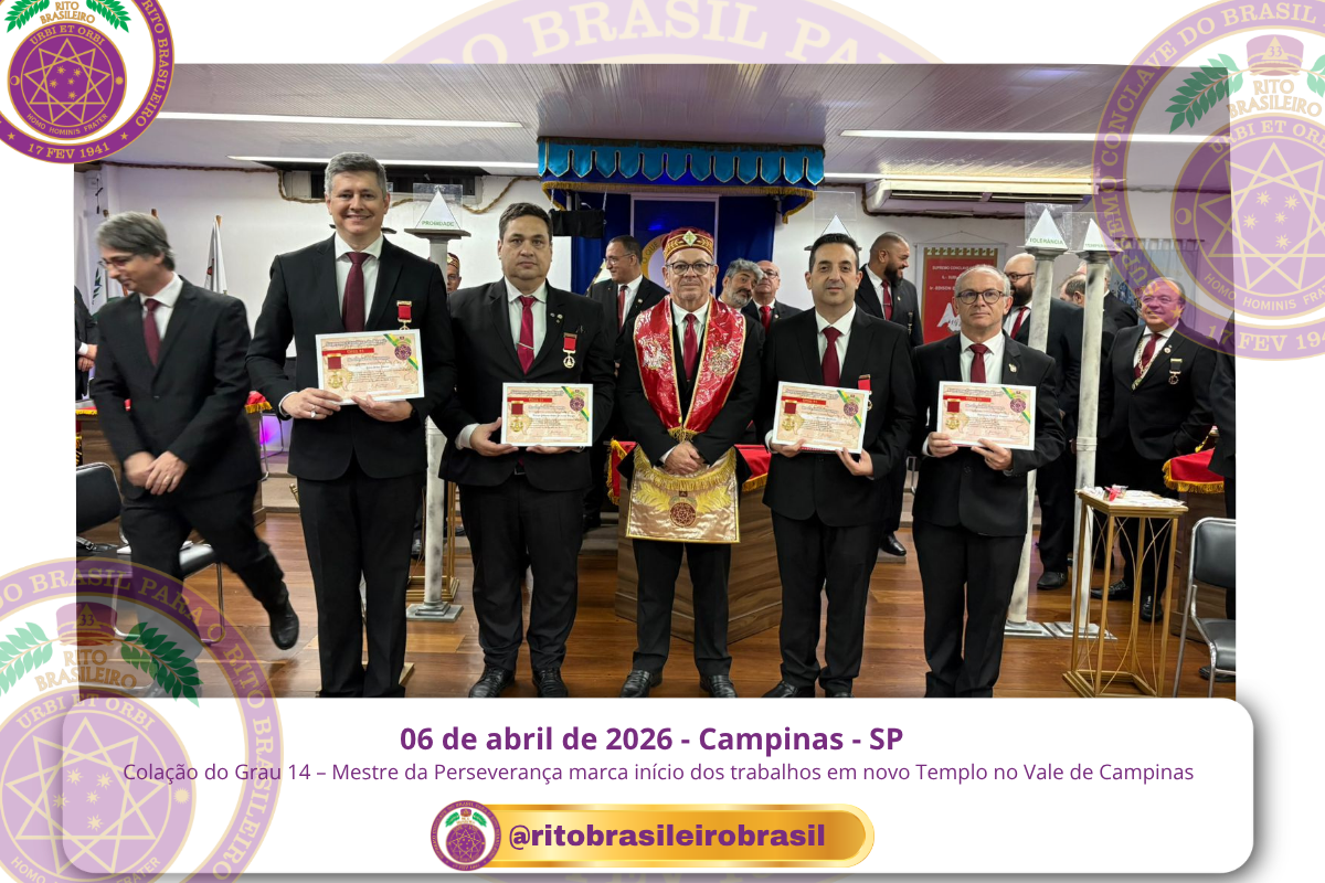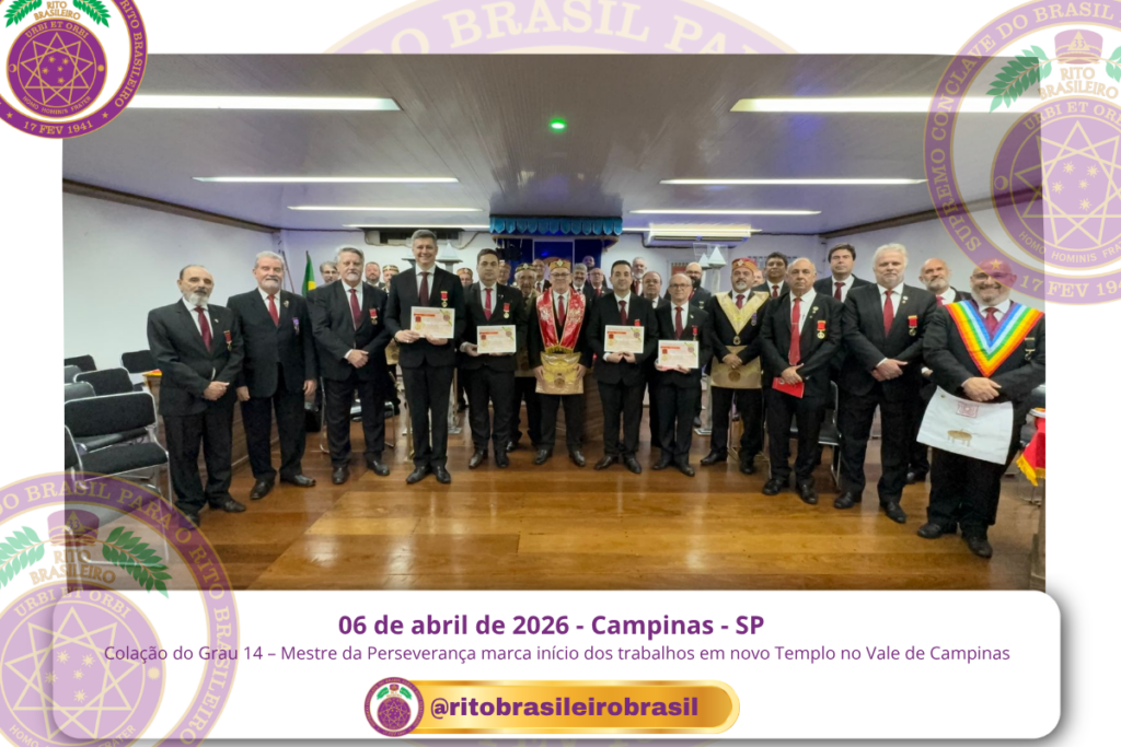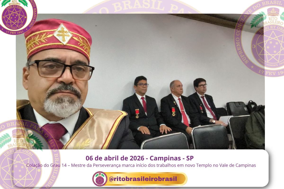 No dia 6 de abril de 2026, o Supremo Conclave do Brasil celebrou um momento de grande significado para o Rito Brasileiro com a realização da Colação do Grau 14 – Mestre da Perseverança pelo O Ilustre e Sublime Capítulo Irmão Edison Barsanti nº 20, no Vale de Campinas, no Clima de São Paulo.