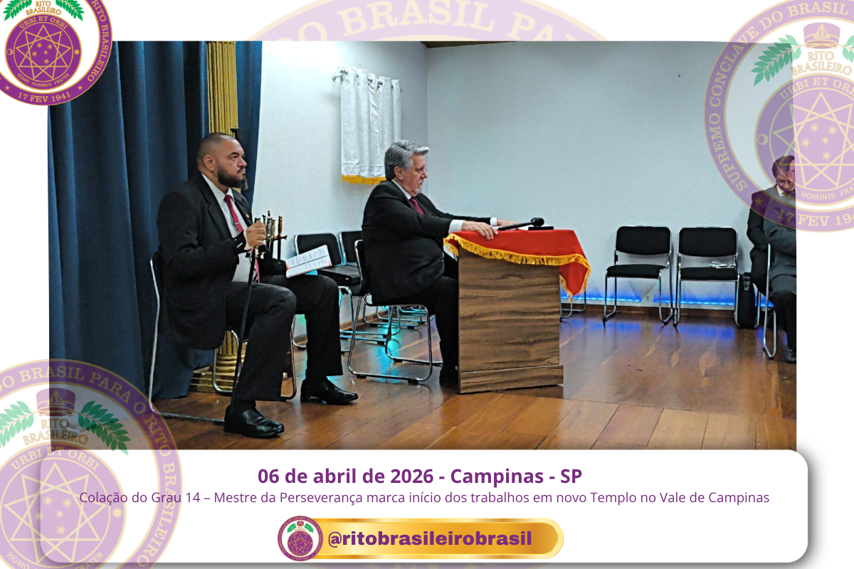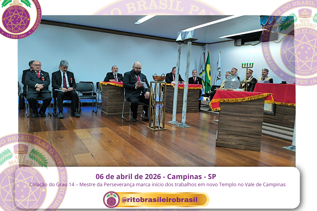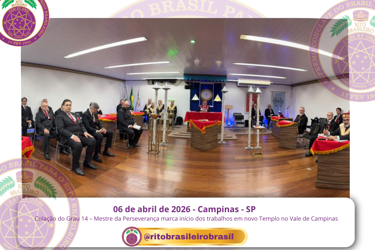 No dia 6 de abril de 2026, o Supremo Conclave do Brasil celebrou um momento de grande significado para o Rito Brasileiro com a realização da Colação do Grau 14 – Mestre da Perseverança pelo O Ilustre e Sublime Capítulo Irmão Edison Barsanti nº 20, no Vale de Campinas, no Clima de São Paulo.