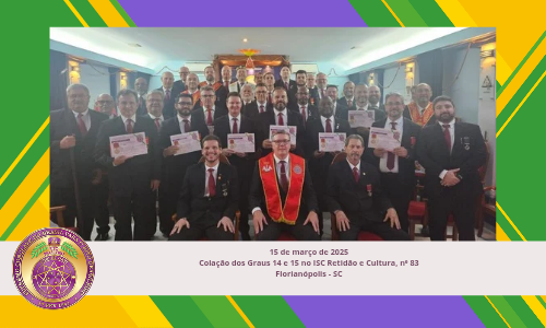 No último sábado, 15 de março de 2025, ao Clima de Florianópolis – SC, o ISC Retidão e Cultura n.º 83, sob a presidência do Aterzata Geovani Bortolini, foram realizadas duas colações de grau, uma do Grau 15 e outra do Grau 14, totalizando o avanço de 17 irmãos em sua caminhada dentro do Rito Brasileiro. Estiveram presentes 41 irmãos. Na ocasião aconteceu a entrega dos diplomas, comendas, rituais e credenciais aos iniciados. Estavam presentes o Egrégio Mestre Itiberê Cornelius Ewerling, 33, do CAC Mário Dezerto da Silva n.° 222 e o Eminente Ir.’. Salézio Schmidt Júnior, 33.
