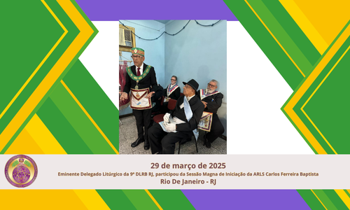 No dia 29 de março de 2025, o Eminente Delegado Litúrgico da 9ª DLRB RJ, participou da Sessão Magna de Iniciação da ARLS Carlos Ferreira Baptista, representando nosso Soberano Grande Primaz Irmão Juliano Coelho Braga e divulgando no Rito Brasileiro na devida forma, conforme prevê o tratado de Amizade e mútuo reconhecimento com o Grande Oriente do Brasil.