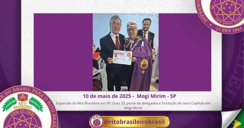 No dia 10 de maio de 2025, a cidade de Mogi Mirim-SP foi palco de importantes avanços para o Rito Brasileiro, com a realização das Sessões Magnas de Reconhecimento ao Grau 33, Posse dos Delegados Litúrgicos, Regularização do Ilustre e Sublime Capítulo Humanismo – nº 121 e Colação do Grau 4 – Mestre da Discrição.