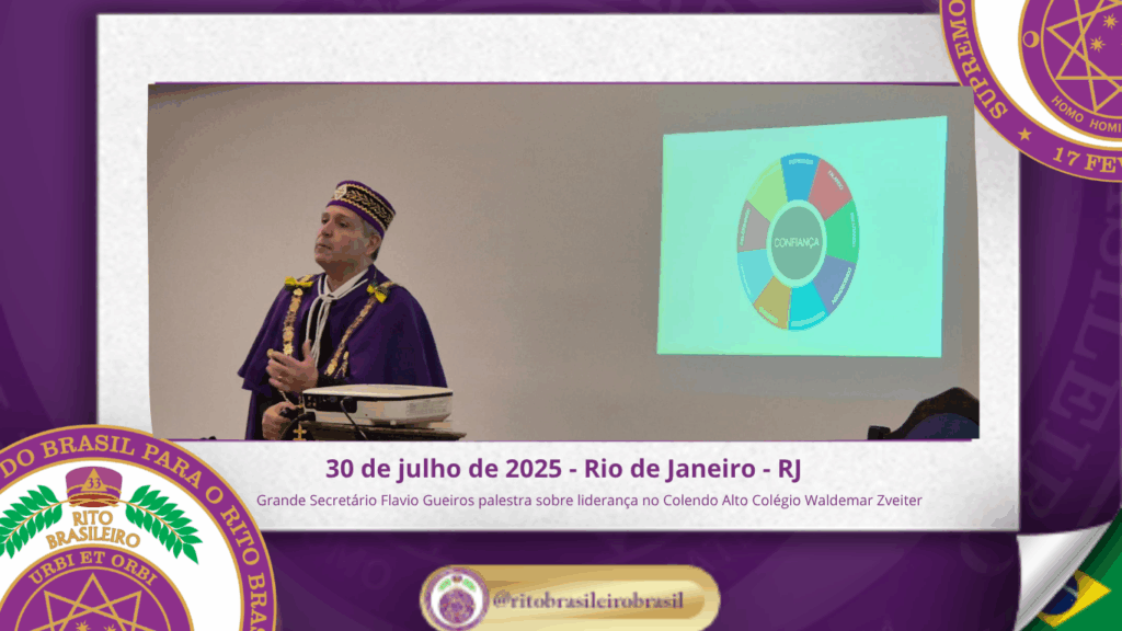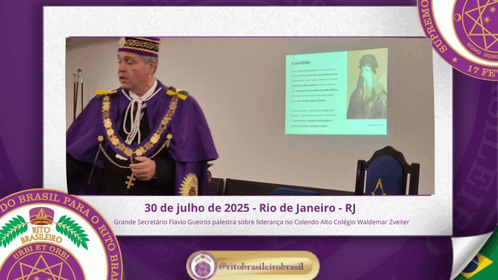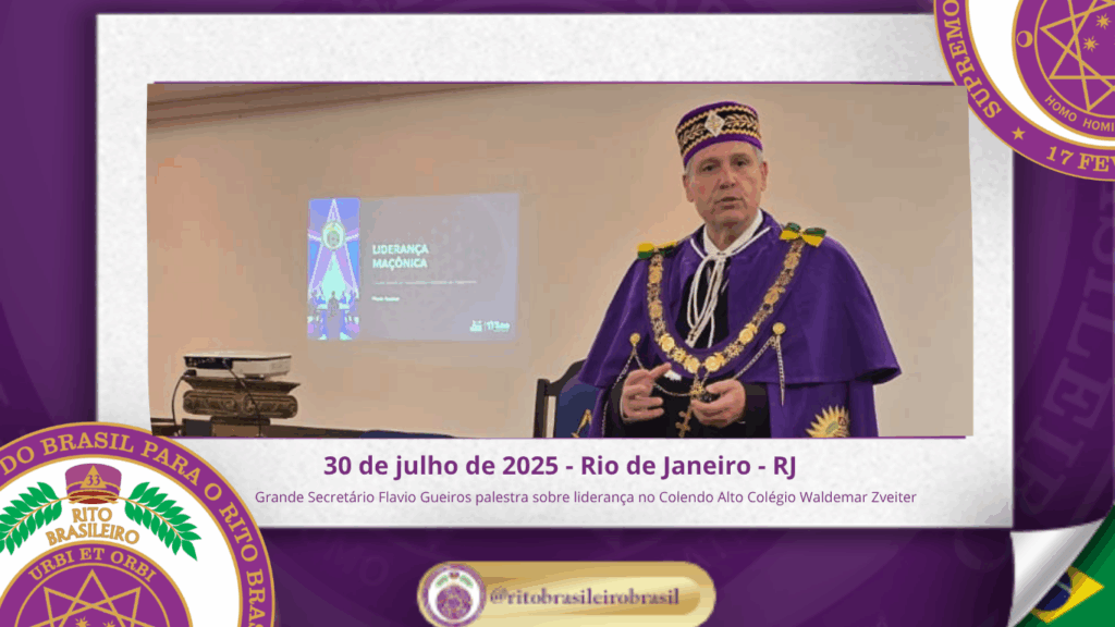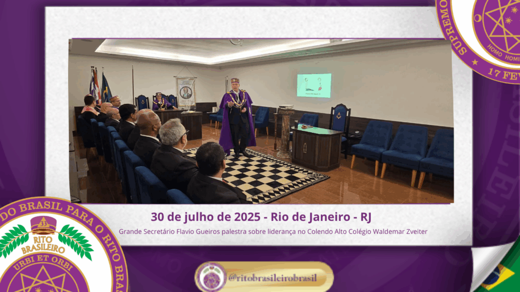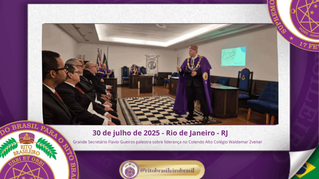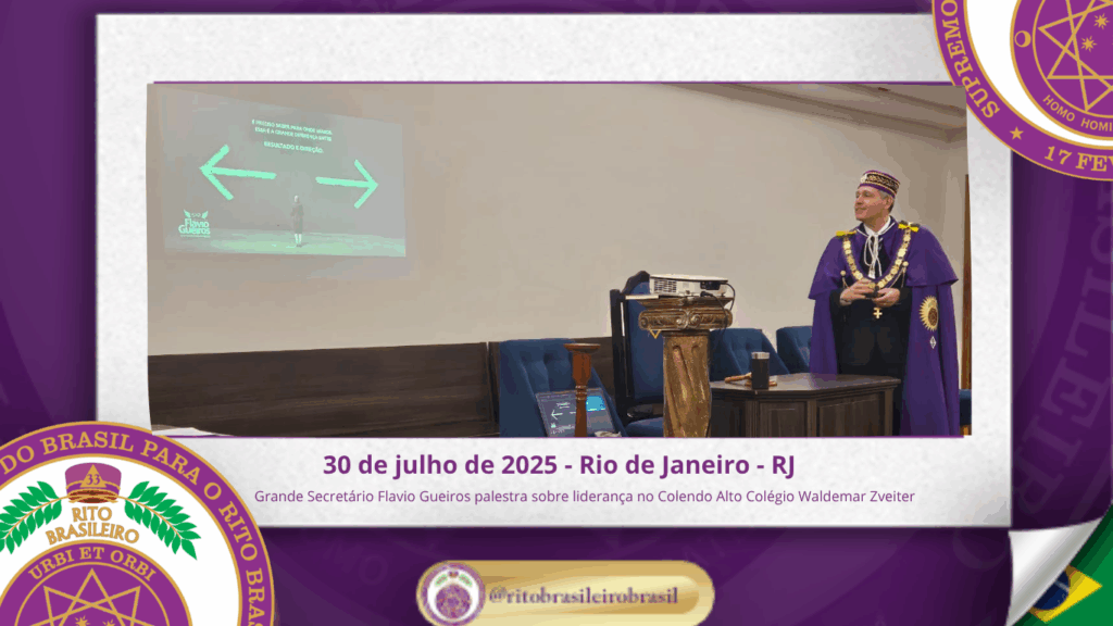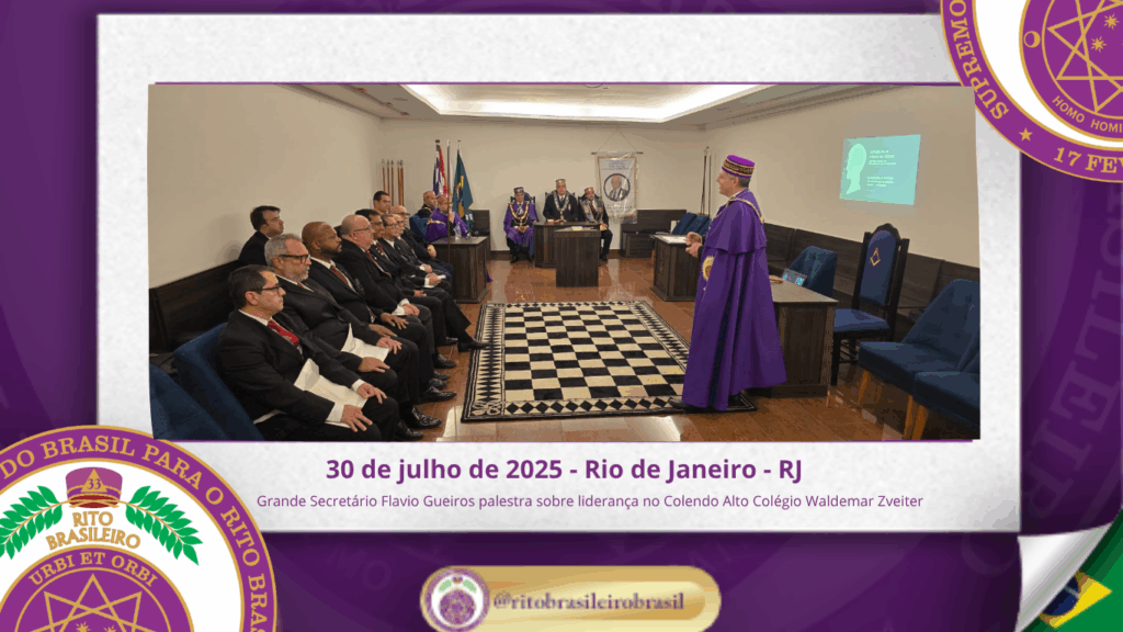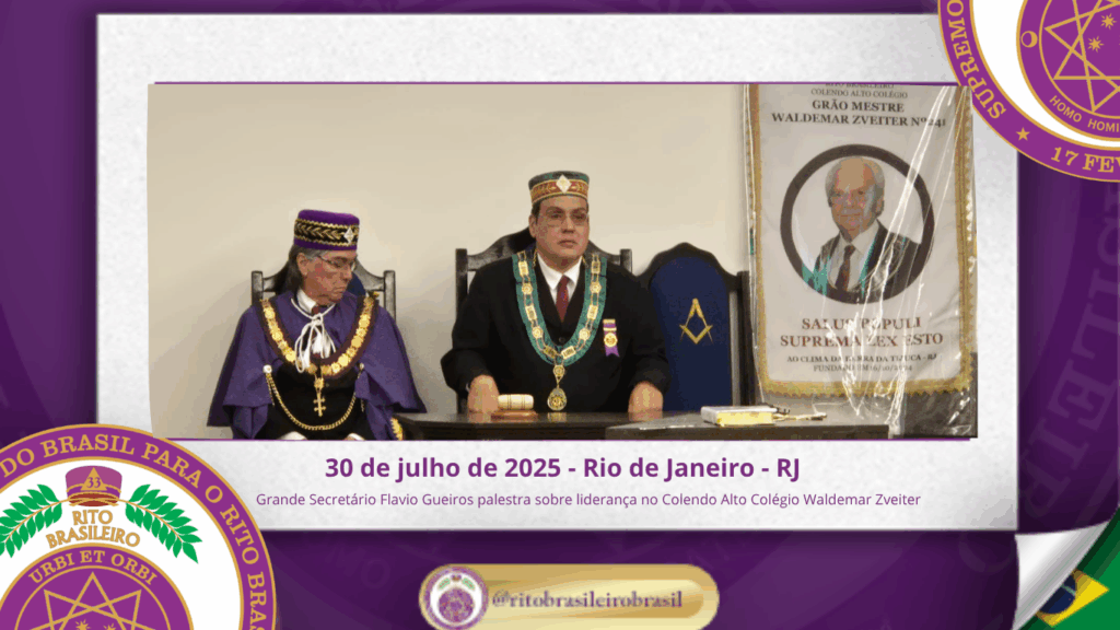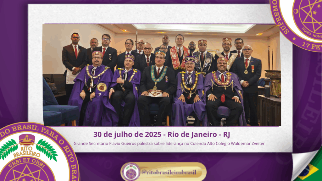No dia trinta de julho de dois mil e vinte e cinco, o Colendo Alto Colégio Grão-Mestre Waldemar Zveiter promoveu uma inspiradora Sessão Aberta ao Vale do Rio de Janeiro, recebendo como palestrante o Sereníssimo Irmão Flavio Gueiros, Grande Secretário do Supremo Conclave do Brasil para o Rito Brasileiro, que proferiu a envolvente palestra “Liderança Maçônica: Valores, Vocação e Influência”.