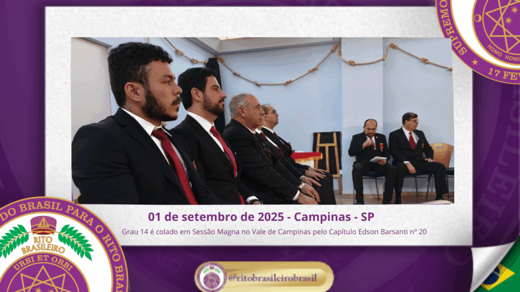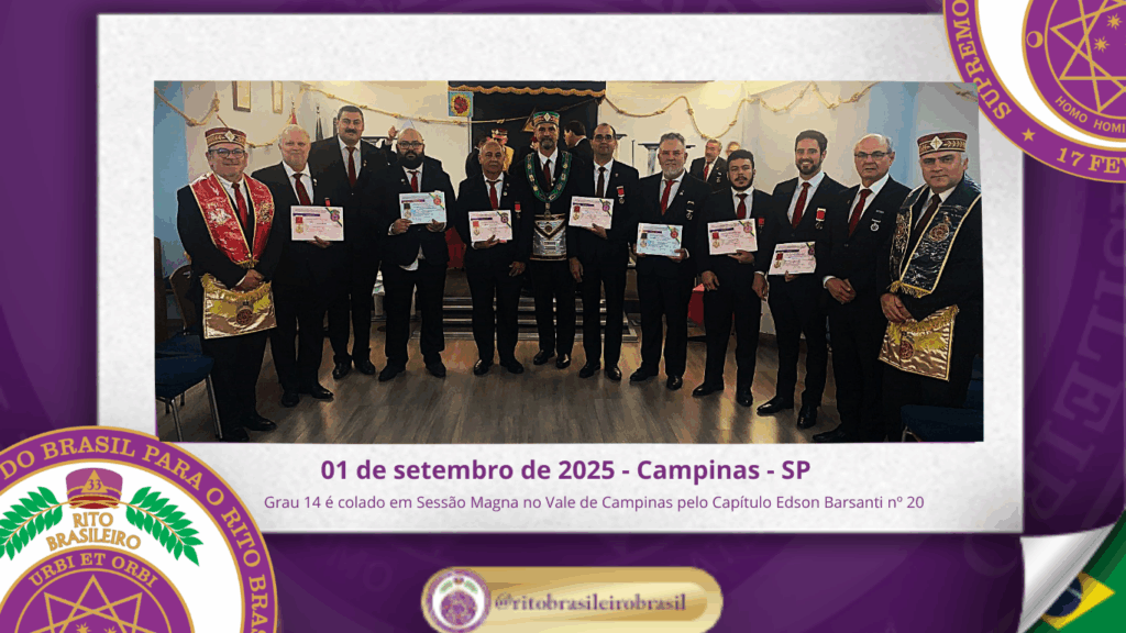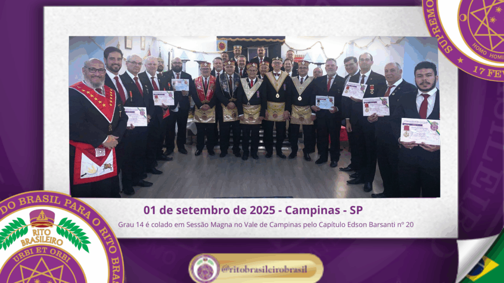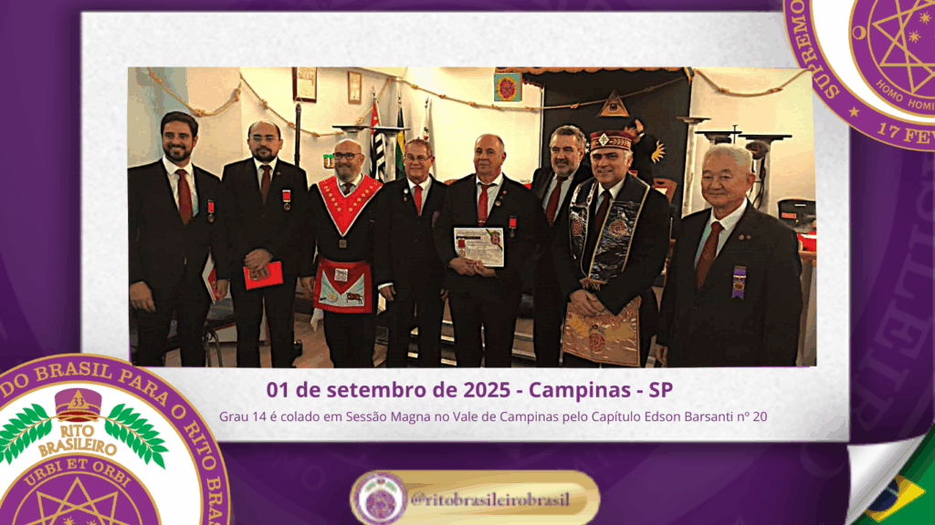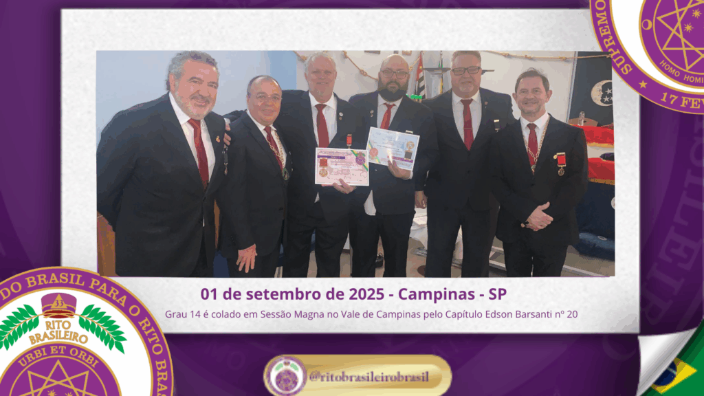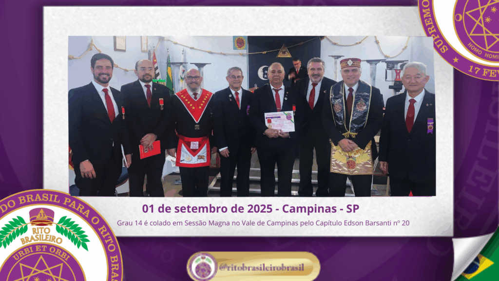 No dia primeiro de setembro de dois mil e vinte e cinco, ao Vale de Campinas/SP, foi realizada no Ilustre e Sublime Capítulo Edson Barsanti, nº 20, a Sessão Magna de Colação do Grau 14 – Mestre da Perseverança dos Ilustres Irmãos Daniel Dela Coleta Eisaqui, Diego Henrique Darli, Eduardo Pereira, Relison Augusto Possidônio e Ricardo Mazzon, reafirmando a força do Rito Brasileiro no âmbito da 4ª Delegacia Litúrgica do Estado de São Paulo.