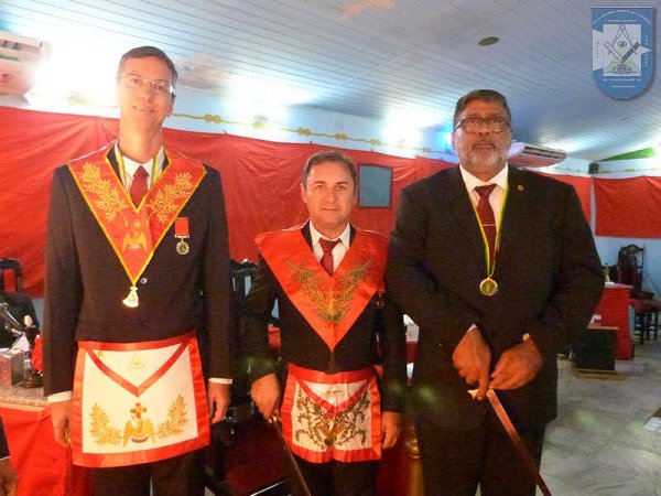 Os novos Cavaleiros Rosa-Cruz HÉRCULES CARNEIRO e ADILSON CORREIA, também foram revestidos com os paramentos do Grau 18; ao lado o Cav.’. Rosa Cruz JORGE LUIZ, portando a Espada do Cavaleiro.