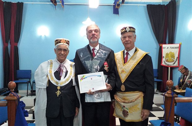 O Preclaro Ir∴ com as credenciais recebidas no decorrer da magna sessão, ladeado pelo Sob∴ Ir∴ Nei Inocencio dos Santo 33º e João Bosco Laviola, padrinho do Preclaro Ir∴ elevado