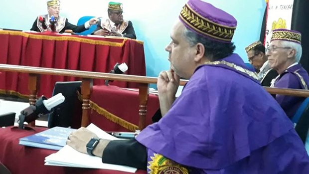O Sob∴ Ir∴ Nei Inocencio dos Santos 33º, tendo à sua direita, o Em.’. Ir.’. Jorge Romeiro 33º, e à sua esquerda, o Em∴ Ir∴ João Dias 33º, Delegados Litúrgicos do Rito Brasileiro