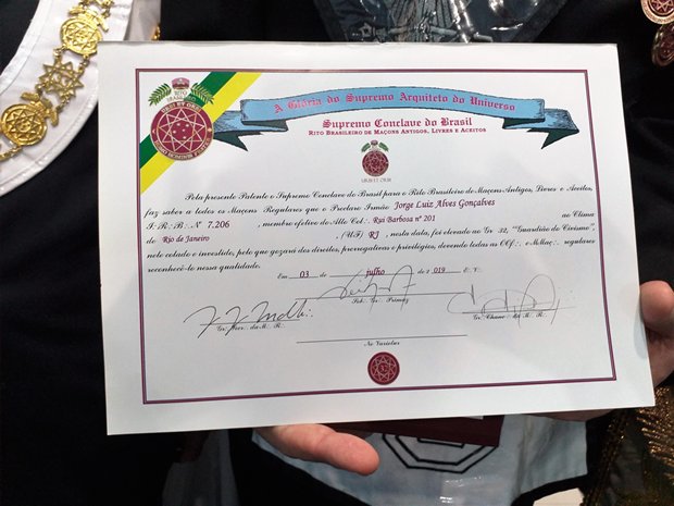 O Preclaro Ir∴ com as credenciais recebidas no decorrer da magna sessão, ladeado pelo Sob∴ Ir∴ Nei Inocencio dos Santo 33º e João Bosco Laviola, padrinho do Preclaro Ir∴ elevado