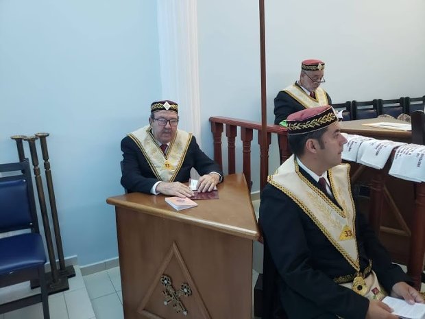Em seguida a Câmara de Grau 33º reuniu-se em SESSÃO MAGNA DE INVESTIDURA DO GRAU 33 DOS PRECLAROS IRMÃOS CARLOS EDUARDO EMILIO CURCI, HUMBERTO TELES DE ALMEIDA, LUIZ DAVID COSTA FARIA, PAULO RODRIGO ALVES DE AZEVEDO, PEDRO CUNHA FILHO, RONALDO VLADEMIR FERREIRA e SÉRGIO GAMA JÚNIOR.
