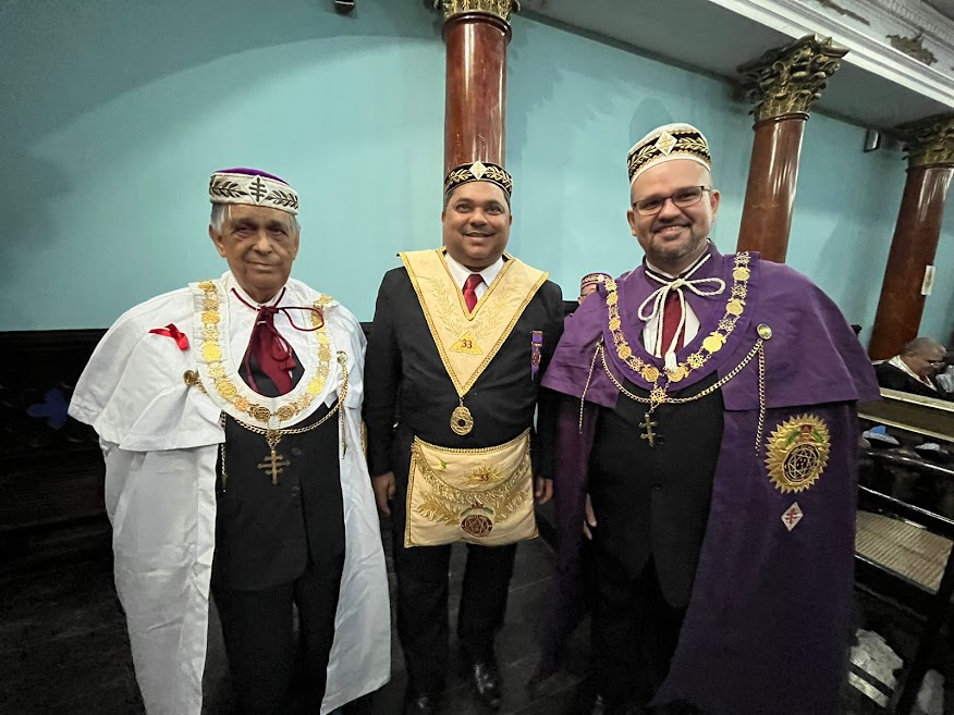 O Sob.’. Ir.’. Nei Inocencio dos Santos 33º revestido com os Paramentos e Grão Mestre de Honra da Grande Loja Maçônica de Pernambuco, parabenizado pelos Sereníssimos Irmãos José Teruo Mizuno 33º e Guilherme Cavalcanti de Andrade Neves 33º