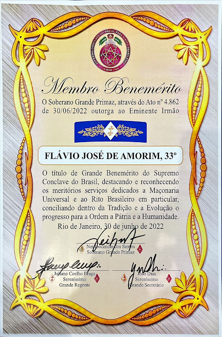 • Concessão do Título Distintivo de Grande Benemérito do Supremo Conclave do Brasil ao Sereníssimo Irmão Flávio José de Amorim, Grão-Mestre da Grande Loja Maçônica de Pernambuco; e