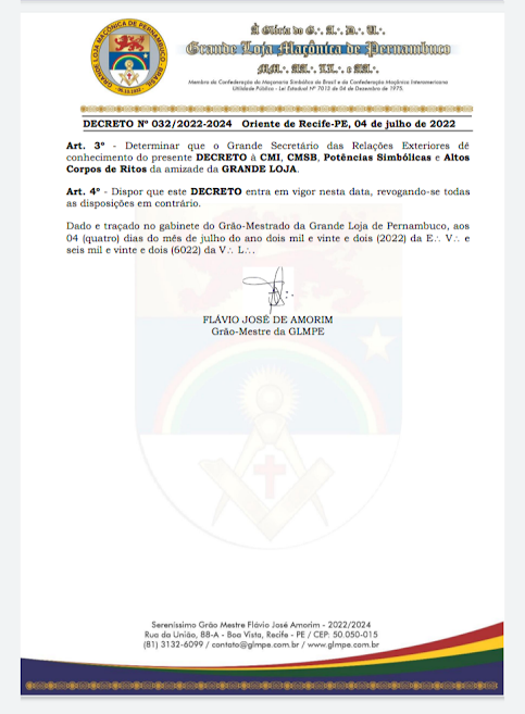 • Reconhecimento do Grau 33 de Irmãos dos Altos Graus do Rito Adonhiramita e Escocês, membros, nos Graus Simbólicos, da Grande Loja Maçônica de Pernambuco;