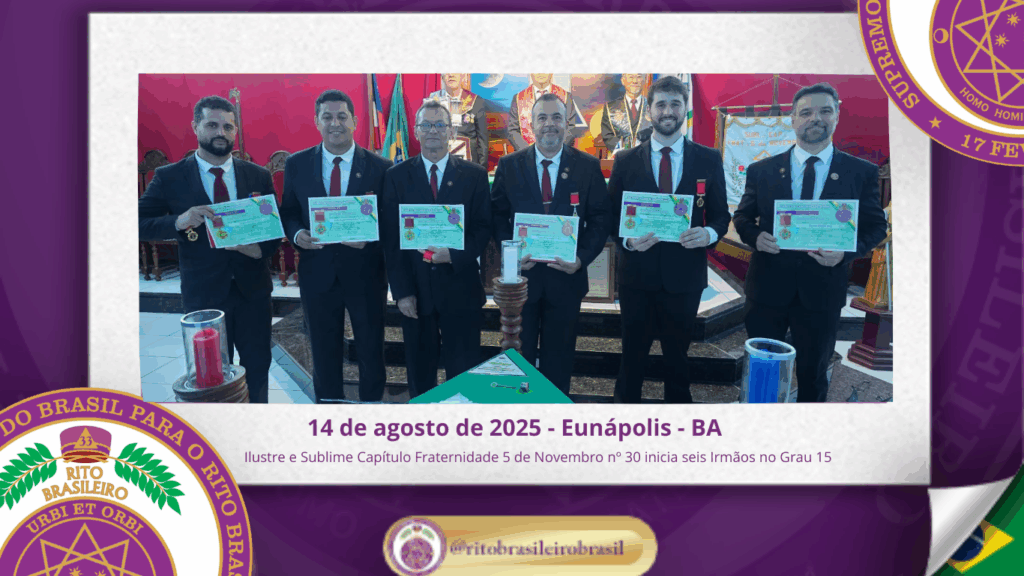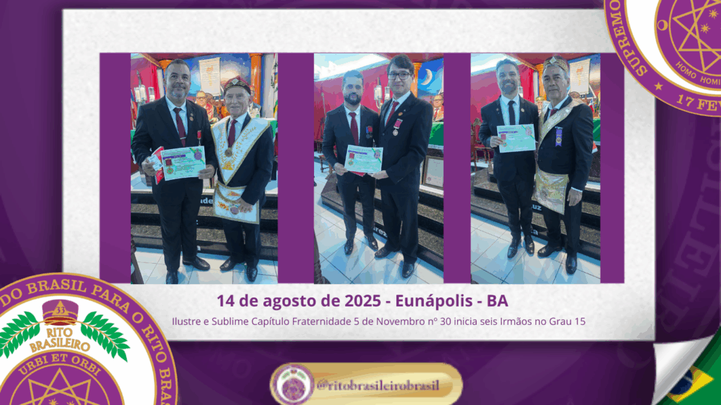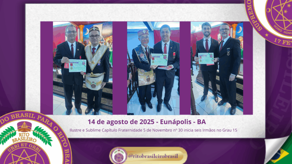 No dia doze de agosto de dois mil e vinte e cinco, no Ilustre e Sublime Capítulo Fraternidade 5 de Novembro nº 30, ao Vale de Eunápolis – BA, foi realizada a Sessão Magna de Iniciação ao Grau 15 – Mestre da Liberdade.
