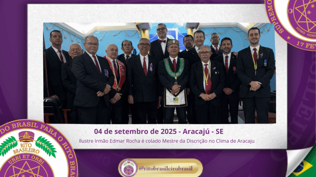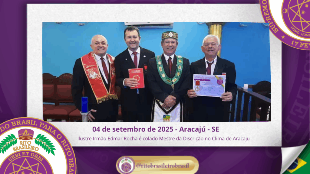 Durante a sessão, o Ilustre Irmão Edmar Nogueira Rocha foi solenemente colado no Grau 4 – Mestre da Discrição, passo inicial dos Altos Graus Filosóficos do Rito Brasileiro, representando seu ingresso na jornada filosófica que culmina no serviço à Ordem, à Pátria e à Humanidade.