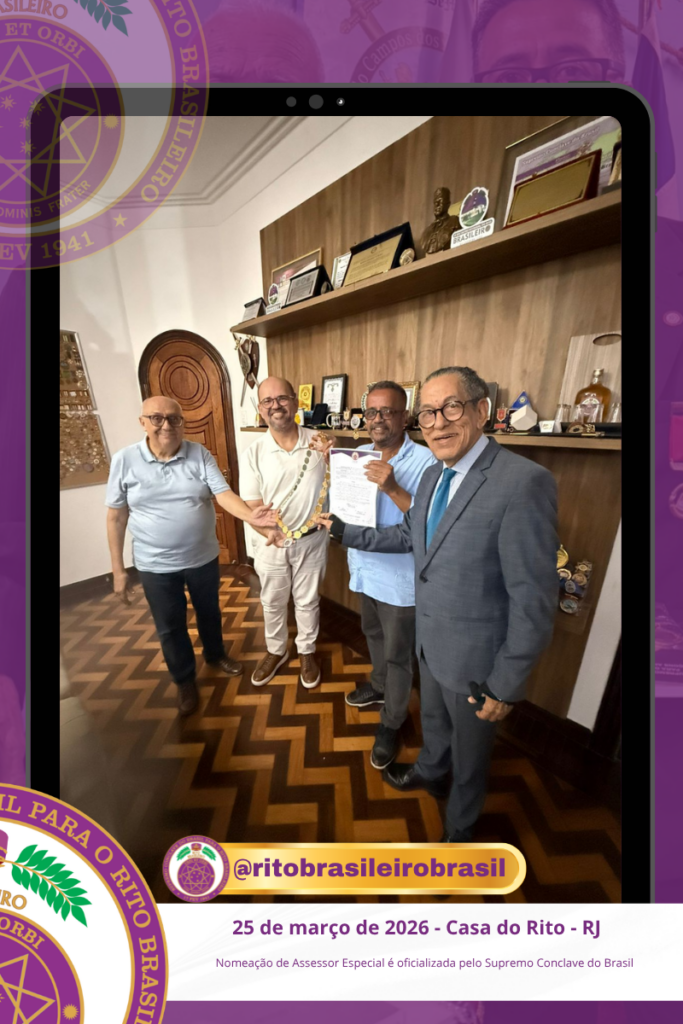 No dia 25 de março de 2026, na Casa do Rito Brasileiro, o Soberano Grande Primaz Juliano Coelho Braga, ao lado do Sereníssimo Irmão Cesar Dourado, Grande Regente do Supremo Conclave do Brasil, recebeu o Eminente Irmão Cícero Paulino da Silva Nogueira, Delegado Litúrgico da 9ª Delegacia Litúrgica do Rito Brasileiro no Clima do Rio de Janeiro.