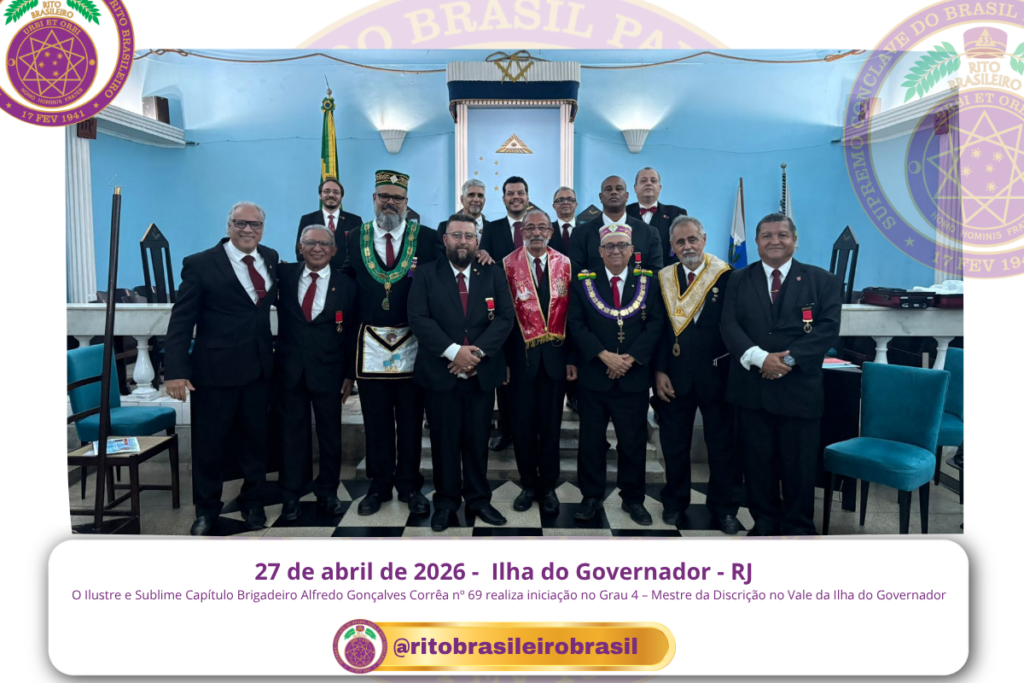 No dia 27 de abril de 2026, O Ilustre e Sublime Capítulo Brigadeiro Alfredo Gonçalves Corrêa nº 69 realizou uma importante Sessão de iniciação no Grau 4 – Mestre da Discrição, no Vale da Ilha do Governador, marcada pela presença de grandes autoridades do Rito Brasileiro e pela solene recepção aos novos Obreiros dos Altos Graus Filosóficos.