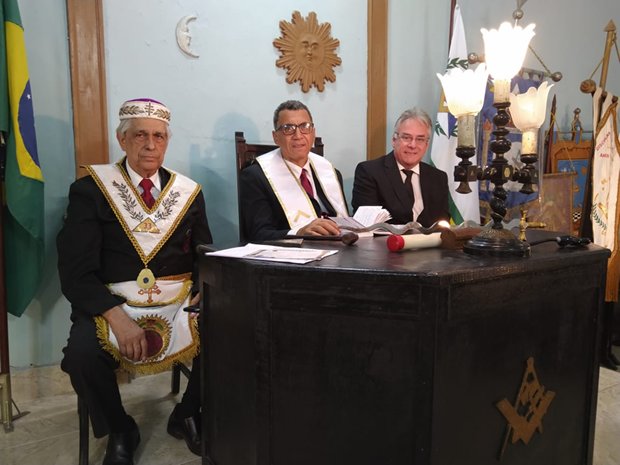 O Altar do Venerável Mestre foi ornado com as presenças do Sob∴ Ir∴ NEI INOCENCIO DOS SANTOS 33º, Grande Primaz do Rito Brasileiro e pelo Venerável Mestre Ir∴ CARLOS TORRES DE MACEDO COSTA, da Loja Maçônica ARY DE AZEVEDO MORAES Nº 3914, que compareceu à sessão acompanhado de 8 (Oito) Irmãos da Loja que preside. (Foto acima)