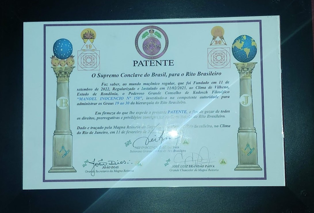 No ensejo, o Eminente Irmão OSWALDO DOS SANTOS 33º, recebeu o seu DIPLOMA DE REGULARIDADE e a NOVA IDENTIDADE DO RITO, das mãos do Em.’. Ir.’. NELSON RANGEL SOARES FILHO 33º, Delegado Litúrgico da 2ª Delegacia do Rito Brasileiro, para o Estado de Rondônia, por estar em dia com seus metais para com o Supremo Conclave do Brasil. Encerrada a sessão foi feito um breve intervalo, para a realização do ultimo evento, que foi a SESSÃO MAGNA DE REGULARIZAÇÃO DO PODEROSO GRANDE CONSELHO DE KADOSCH FILOSÓFICO MANOEL INOCENCIO Nº 158, ao clima de Vilhena/RO.